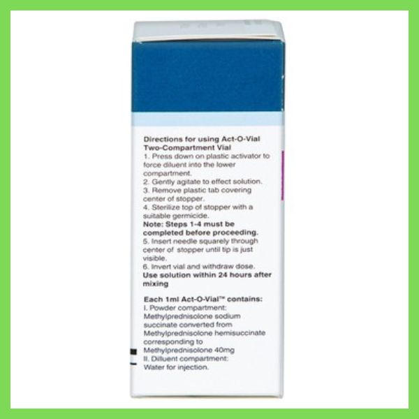 Điểm đặc biệt của Solu-Medrol 40mg là thiết kế lọ Act-O-Vial (2 ngăn). Người sử dụng không cần dùng kim tiêm để rút nước cất từ bên ngoài bơm vào. Cần thực hiện đúng thao tác sau để đảm bảo vô khuẩn: