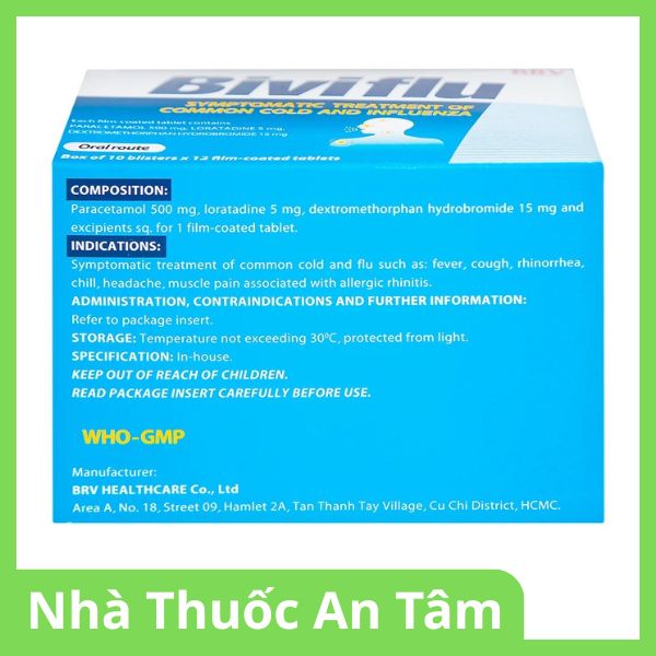 Thuốc Biviflu BRV là thuốc không kê đơn (OTC) được phối hợp bởi 3 hoạt chất chính nhằm điều trị tổng hợp các triệu chứng của cảm cúm và viêm mũi dị ứng. Thuốc được sản xuất bởi Công ty Cổ phần BV Pharma (Việt Nam), đáp ứng nhu cầu giảm nhanh tình trạng sốt, ho và hắt hơi sổ mũi chỉ trong một viên nén.