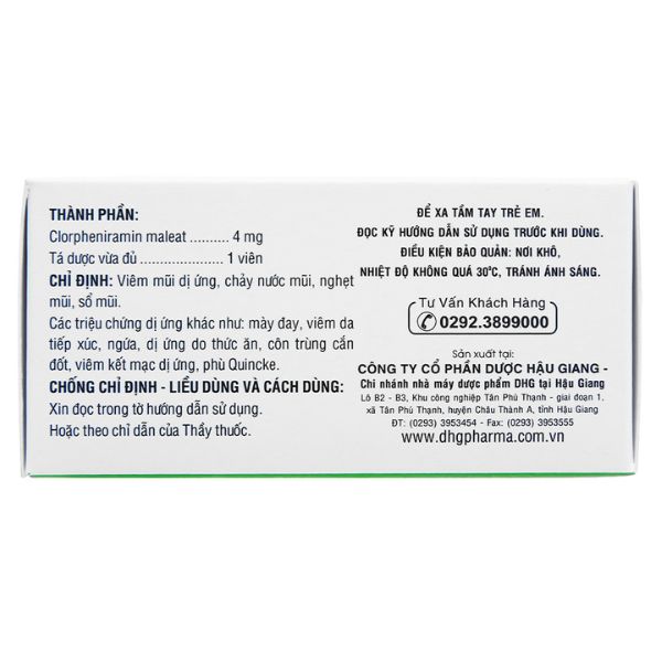Thuốc Clorpheniramin 4 DHG trị viêm mũi dị ứng, mày đay (10 vỉ x 20 viên)