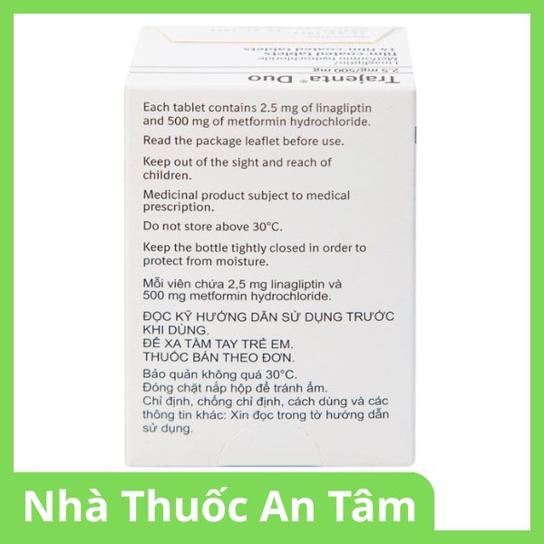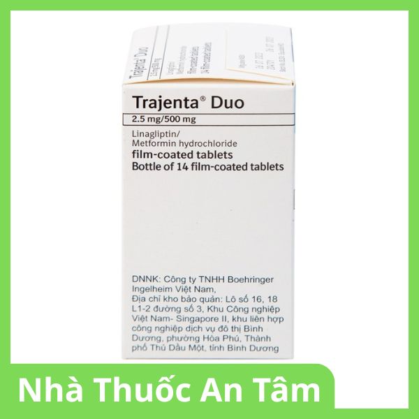 Metformin hydrochloride: Thuộc nhóm biguanide. Hàm lượng Metformin trong Trajenta Duo có thể thay đổi tùy theo quy cách đóng gói (thường gặp là 850mg hoặc 1000mg) để phù hợp với mức độ bệnh lý của từng bệnh nhân.
