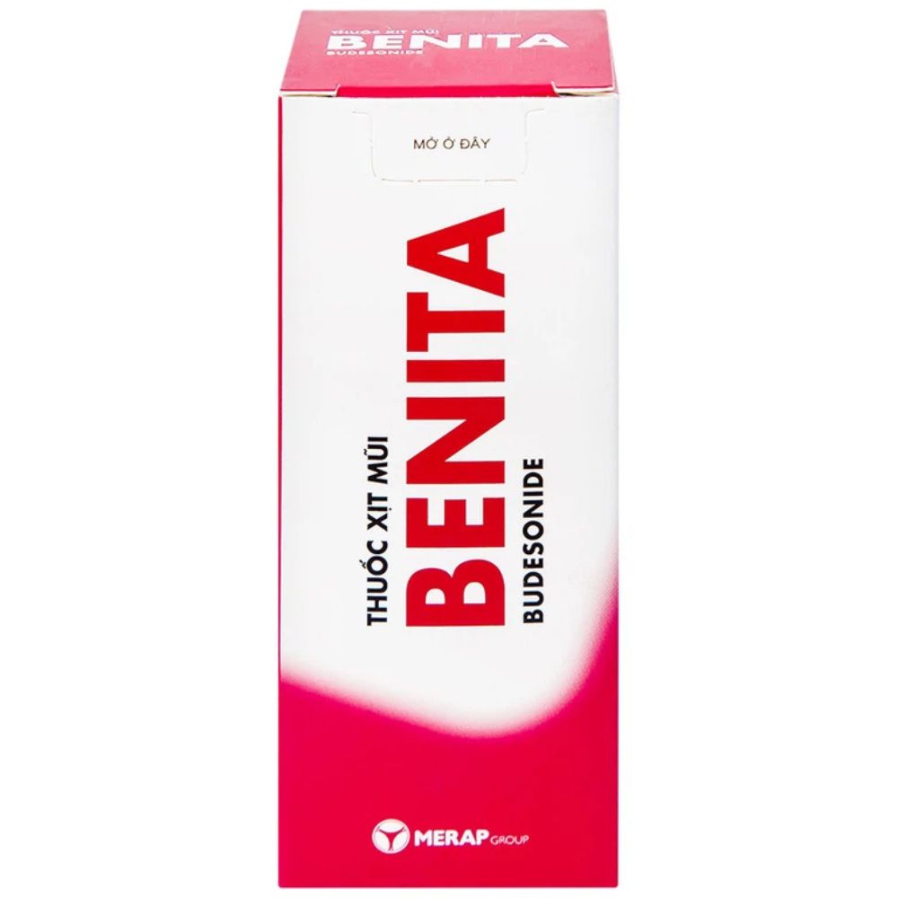 Thuốc xịt mũi Benita Merap (120 liều) là hỗn dịch xịt mũi chứa budesonide 64 mcg/liều, corticosteroid tại chỗ, chỉ định điều trị viêm mũi dị ứng quanh năm và theo mùa, viêm mũi do rối loạn vận mạch, dự phòng và điều trị polyp mũi.